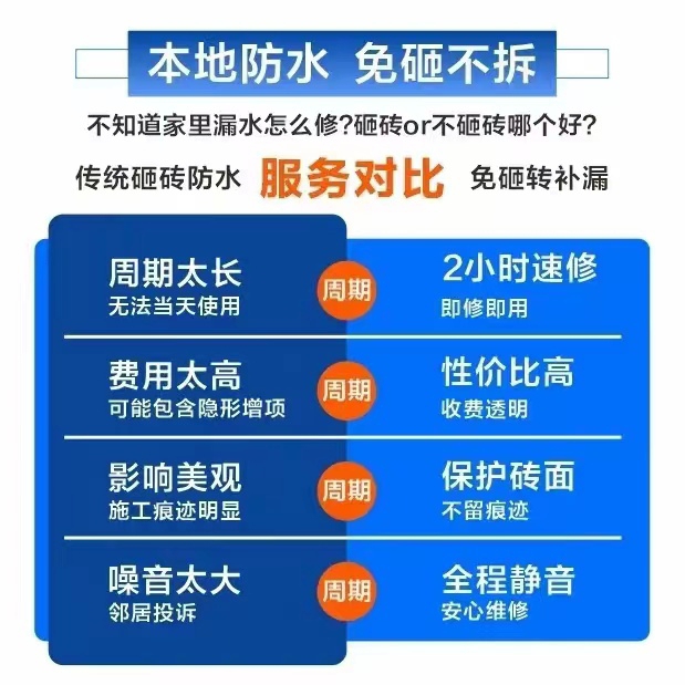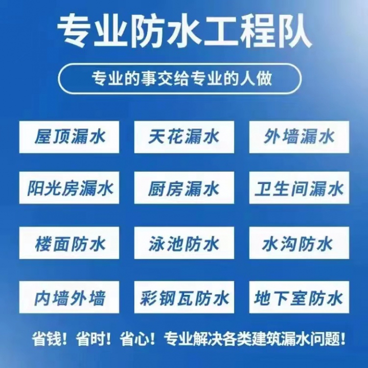 《防水补漏》楼房。平台。阳台。天沟。厨房。房屋顶。飘窗。卫生间漏水免敲墙,免砸砖,快速维修。钢结构漏水维修。阳光房漏水维修。外墙渗水维修。厂房漏水维修。高压注浆。诚信服务。价格便宜。免费上门专业雨虹防水补漏,厨卫免砸砖,质保十年~上门勘察。本人专注防水20年。承接各地区专业雨虹防水补漏,厨卫免砸砖。
